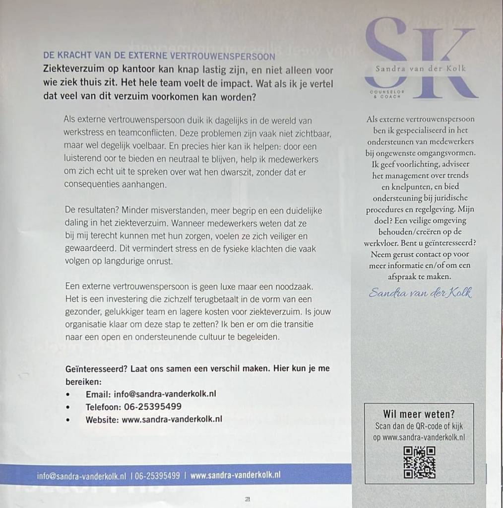 Neemt u gerust contact met me op als u vragen heeft, meer informatie wilt, of een afspraak wilt maken. Ik ben hier om u te helpen en u te ondersteunen.